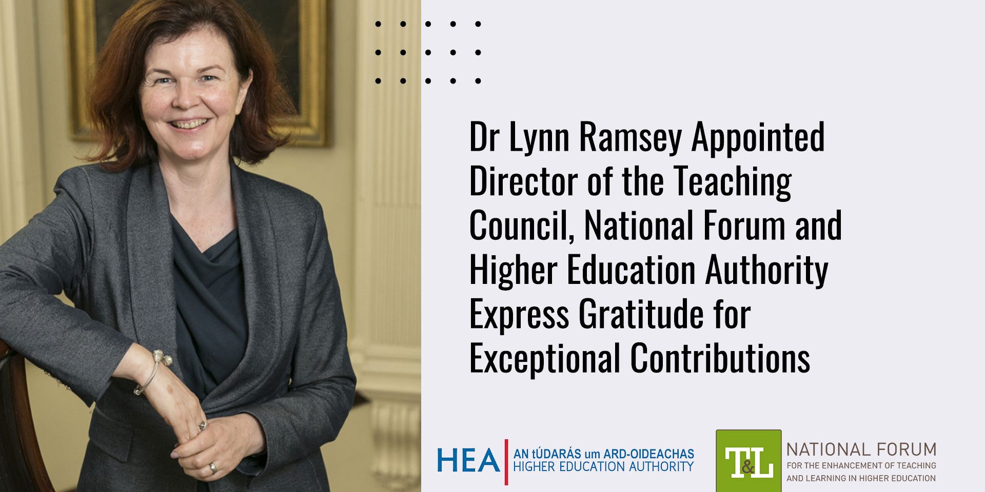 The National Forum for the Enhancement of Teaching and Learning in Higher Education and the Higher Education Authority (HEA) announced today that Dr Lynn Ramsey has stepped down as a member of the HEA board and as Chair of the National Forum’s Teaching and Learning Committee as she commences her new role as Director of the Teaching Council on February 1, 2023.