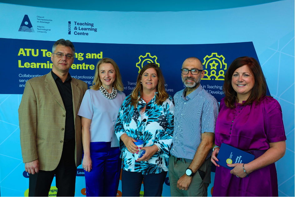 Participants of the MA T&L Applied programme showcasing their innovative projects at DigitalEd25: Dr Doru Boblea (Engineering), Dr Gabriela Gliga (Business) and Dr Luca Mirimin (Science) with supervisor and programme developer from the Teaching and Learning Centre, Annette Cosgrove, Lecturer in Digital T&L and Dr Carina Ginty, Head T&L.