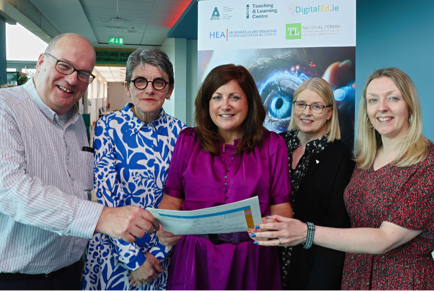 N-TUTORR Transforming Learning programme (2022-2025) leadership team members from across the TU sector catching up at DigitalEd 2025: Ken McCarthy (SETU), Frances O’Connell (TUS), Dr Carina Ginty (ATU), Prof. Jacqueline McCormack (ATU), Dr Hazel Farrell (SETU).