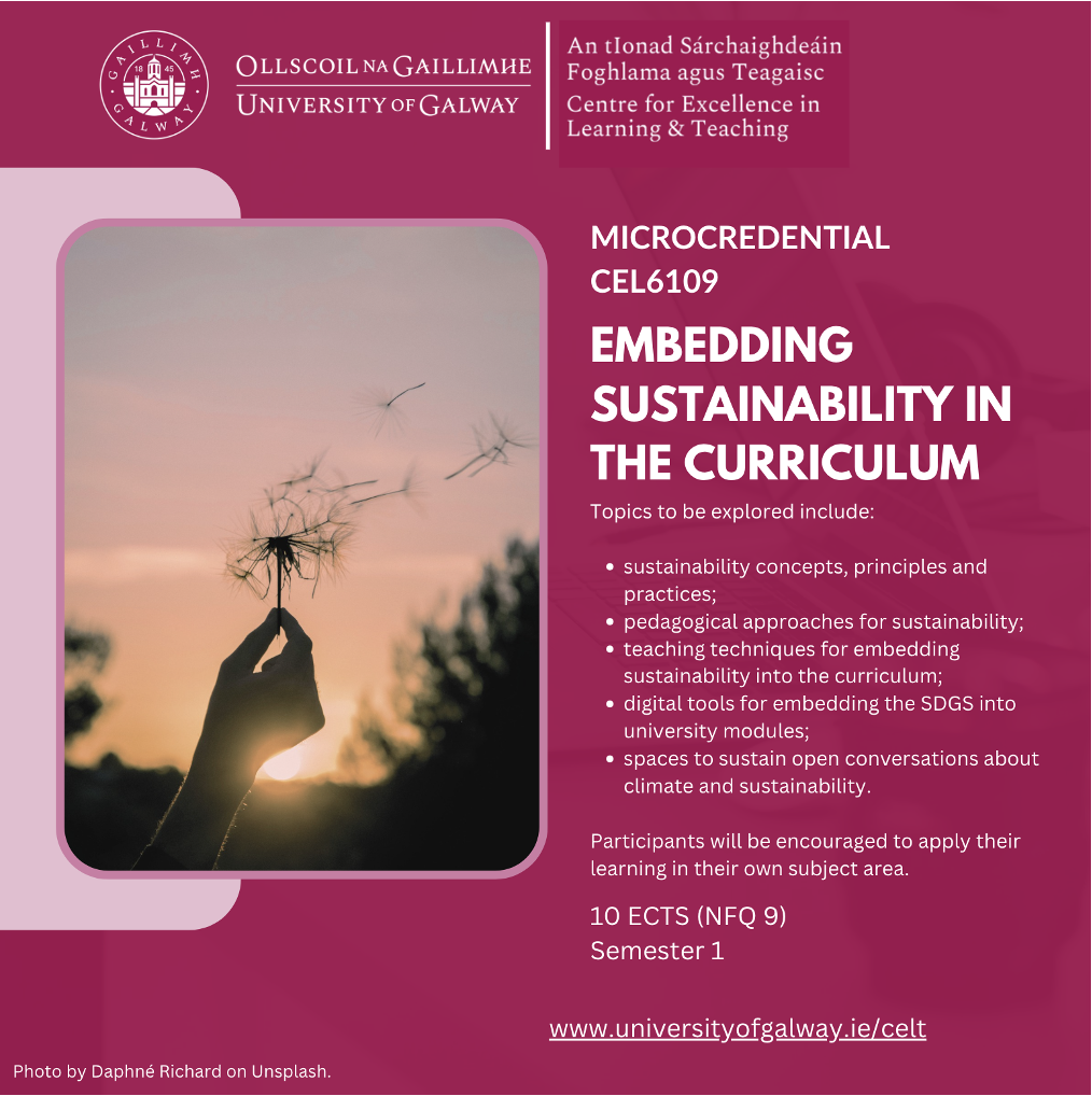 In the 2024/2025 academic year, a new microcredential was developed at the University of Galway. The title of this course was CEL6109 Embedding Sustainability in the Curriculum. It was designed as a 10 ECTS microcredential for any staff member to avail of and as an optional module in the Centre for Excellence in Learning and Teaching (CELT) Masters in Academic Practice.