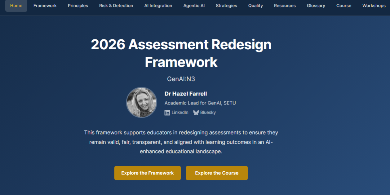 An updated Assessment Redesign Framework (2026) has been developed by Dr Hazel Farrell through the GenAI:N3 national network to support higher education institutions in responding pedagogically and strategically to the growing impact of GenAI on assessment. Rather than focusing on detection-based approaches, the framework highlights validity, transparency, and the visibility of learning as core principles for sustainable assessment practice.