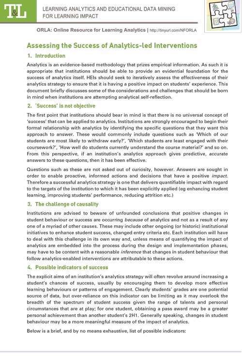 Analytics is an evidence-based methodology that prizes empirical information. As such it is appropriate that institutions should be able to provide an evidential foundation for the success of analytics itself. HEIs should seek to iteratively assess the effectiveness of their analytics strategy to ensure that it is having a positive impact on students’ experience. This document briefly discusses some of the considerations and challenges that should be born in mind when institutions are attempting analytical self-reflection.
