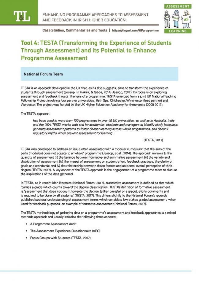 TESTA (Transforming the Experience of Students Through Assessment) and its Potential to Enhance Programme Assessment